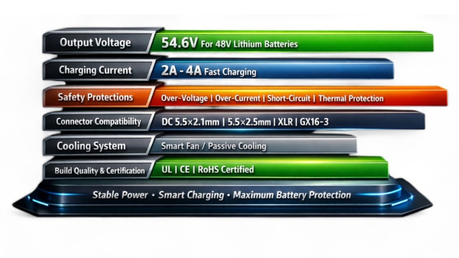 Through all the options mentioned above, attractive features in common are held, 54.6V stable output, intelligent CC-CV charging, abundant safety ensures, reliable construction and visible LED indication.